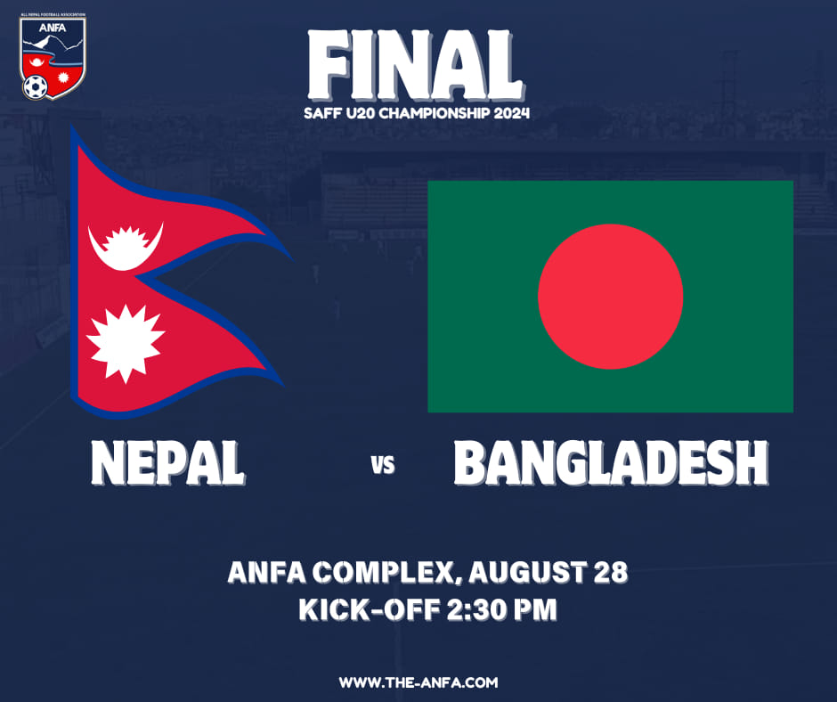 काठमाडौँ । दक्षिण एसियाली फुटबल महासङ्घ (साफ) यु–२० च्याम्पियनपसिप फुटबल प्रतियोगिताको उपाधि भिडन्तमा नेपाल र बङ्गलादेशबीच प्रतिस्पर्धा हुने भएको छ