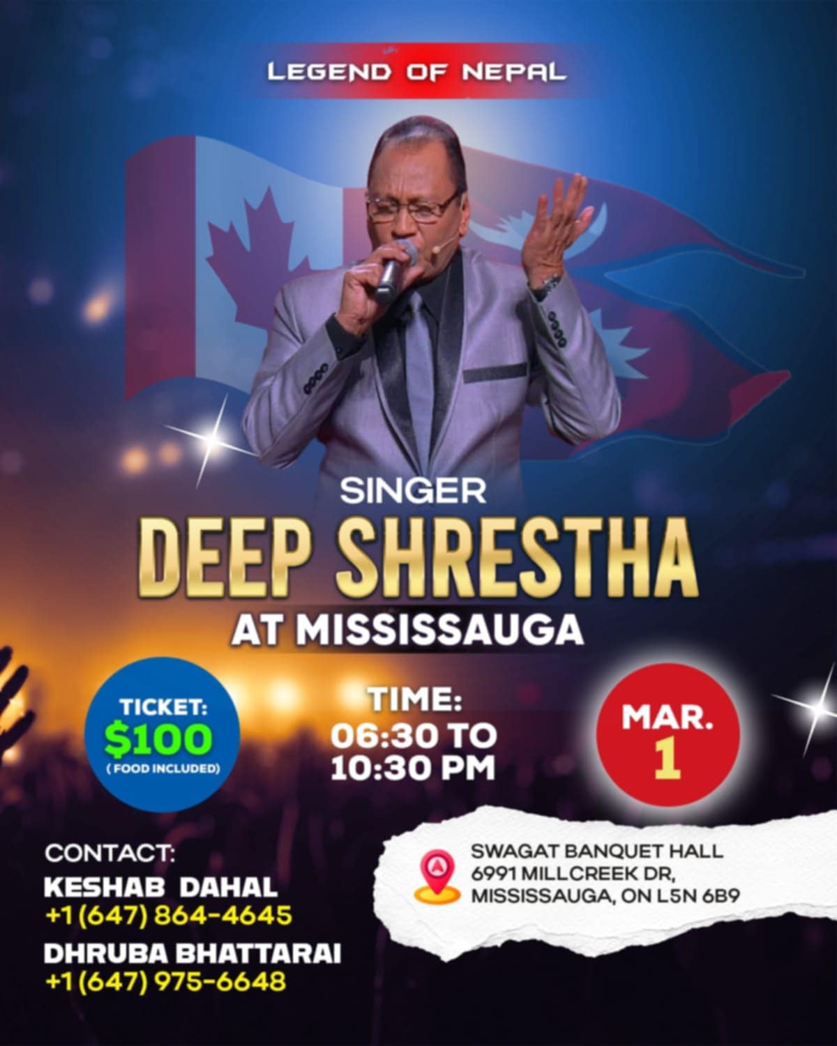 शिशिर सिंखडा, टोरण्टो । नेपाली सांगीतिक आकाशका एक नक्षत्र वरिष्ठ गायक दिप श्रेष्ठको क्यानडामा पहिलो पटक एकल साँझ कार्यक्रम हुने भएको छ।