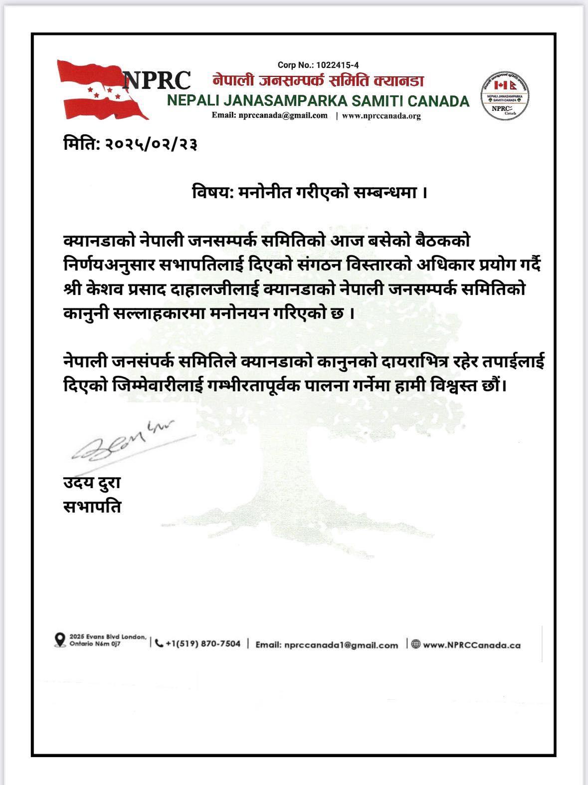 नेपाली जनसम्पर्क समिति क्यानडाको बैठकको निर्णय अनुसार सभापतिलाई दिएको संगठन बिस्तारको अधिकारलाई प्रयोग गर्दै अधिवक्ता दाहाललाई कानुनी सल्लाहकारमा नियुक्त गरिएको बिज्ञप्तिमा जनाईएको छ । पेशाले कानुन व्यवसायी दाहालले नेपालको न्यायीक क्षेत्रमा २०५० साल देखि काम गर्दै काम गर्दै आउनु भएको छ भने क्यानडामा समेत सन २०१६ मा व्यारिस्टरको प्रमाण पत्र लिएदेखि अध्यागमन कानुनको क्षेत्रमा वकालत गर्दै आउनु भएको छ । नेपाल र क्यानडा दुबै देशमा वकालत गर्न पाउने वहाँ पहिलो नेपाली अधिवक्ता समेत हुनुहुन्छ ।